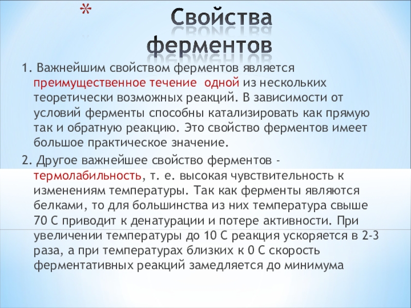 Слайд 231. Важнейшим свойством ферментов является преимущественное течение одной из нескольких теоретически