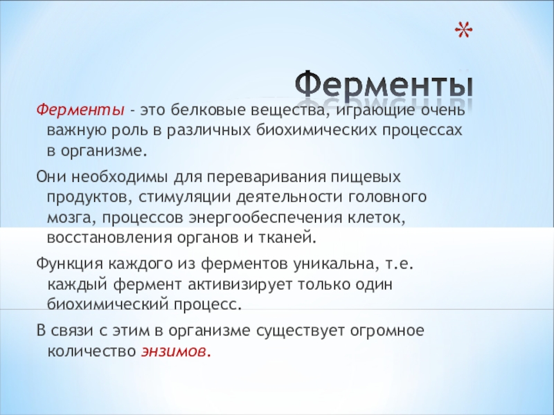 Функция каждого из ферментов уникальна, т.е. каждый фермент активизирует только один биохимический процесс.
