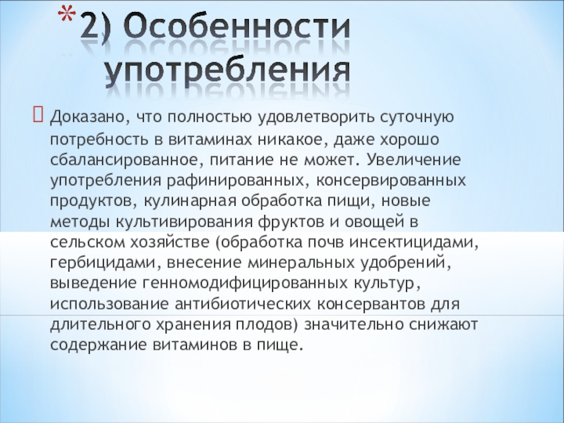 сбалансированное, питание не может. Увеличение употребления рафинированных, консервированных продуктов, кулинарная обработка пищи, новые методы культивирования фруктов и овощей в сельском хозяйстве (обработка почв инсектицидами, гербицидами, внесение минеральных удобрений, выведение генномодифицированных культур, использование антибиотических консервантов для длительного хранения плодов) значительно снижают содержание витаминов в пище.