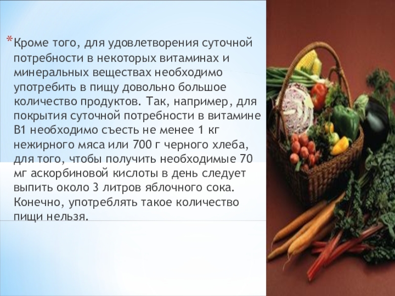 веществах необходимо употребить в пищу довольно большое количество продуктов. Так, например, для покрытия суточной потребности в витамине В1 необходимо съесть не менее 1 кг нежирного мяса или 700 г черного хлеба, для того, чтобы получить необходимые 70 мг аскорбиновой кислоты в день следует выпить около 3 литров яблочного сока. Конечно, употреблять такое количество пищи нельзя.