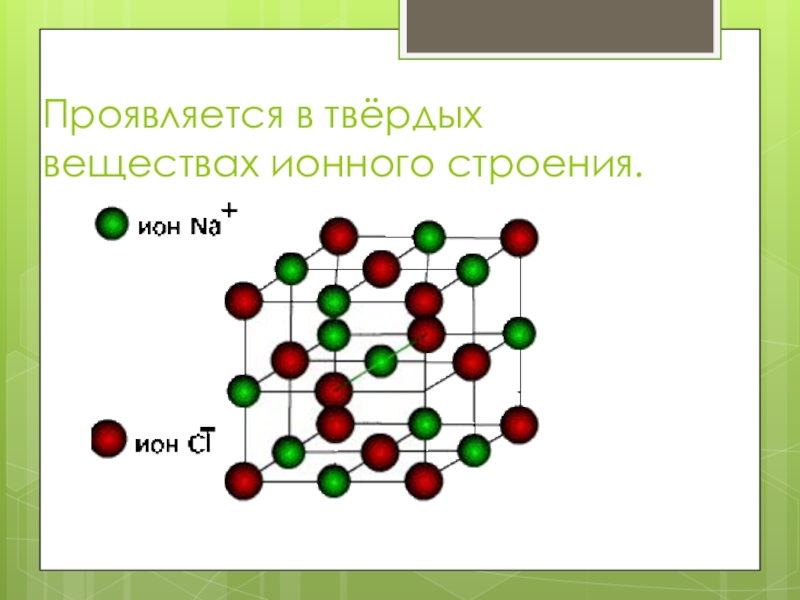 Слайд 9Проявляется в твёрдых веществах ионного строения.