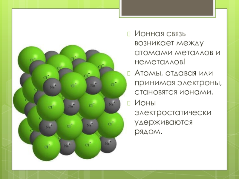 Ионная связь возникает между атомами металлов и неметаллов!Атомы, отдавая или принимая электроны,становятся ионами.Ионы электростатически удерживаются рядом.