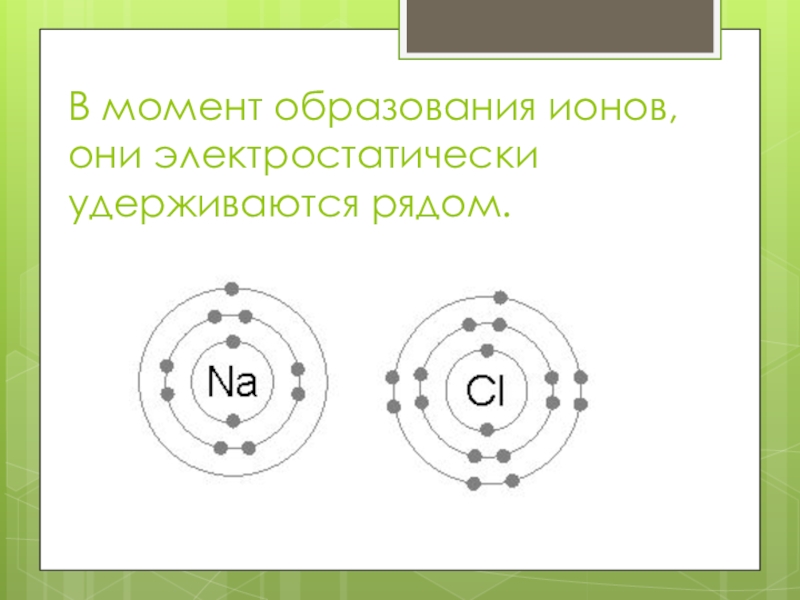 Слайд 6В момент образования ионов, они электростатически удерживаются рядом.