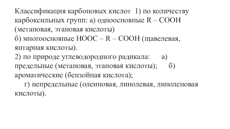 а) одноосновные R – COOH (метановая, этановая кислоты) б) многоосновные
