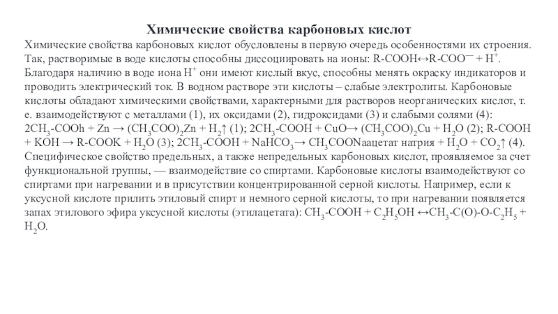 особенностями их строения. Так, растворимые в воде кислоты способны диссоциировать на ионы: R-COOH↔R-COO— + H+. Благодаря наличию в воде иона H+ они имеют кислый вкус, способны менять окраску индикаторов и проводить электрический ток. В водном растворе эти кислоты – слабые электролиты. Карбоновые кислоты обладают химическими свойствами, характерными для растворов неорганических кислот, т.е. взаимодействуют с металлами (1), их оксидами (2), гидроксидами (3) и слабыми солями (4): 2CH3-COOh + Zn → (CH3COO)2Zn + H2↑ (1); 2CH3-COOH + CuO→ (CH3COO)2Cu + H2O (2); R-COOH + KOH → R-COOK + H2O (3); 2CH3-COOH + NaHCO3→ CH3COONaацетат натрия + H2O + CO2↑ (4). Специфическое свойство предельных, а также непредельных карбоновых кислот, проявляемое за счет функциональной группы, — взаимодействие со спиртами. Карбоновые кислоты взаимодействуют со спиртами при нагревании и в присутствии концентрированной серной кислоты. Например, если к уксусной кислоте прилить этиловый спирт и немного серной кислоты, то при нагревании появляется запах этилового эфира уксусной кислоты (этилацетата): CH3-COOH + C2H5OH ↔CH3-C(O)-O-C2H5 + H2O.
