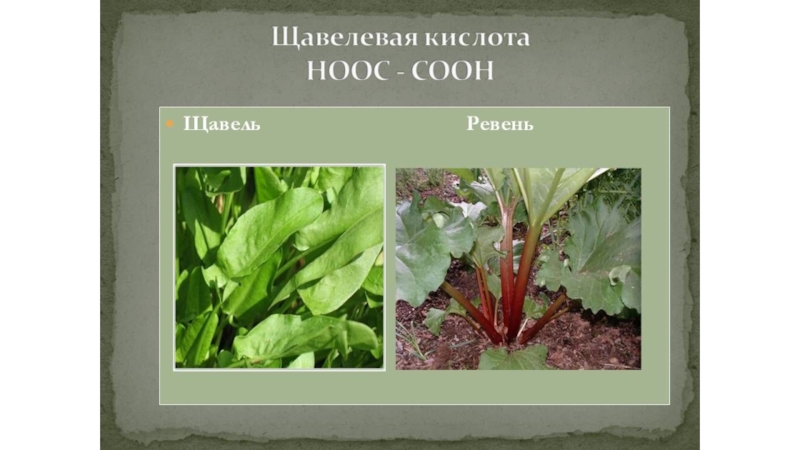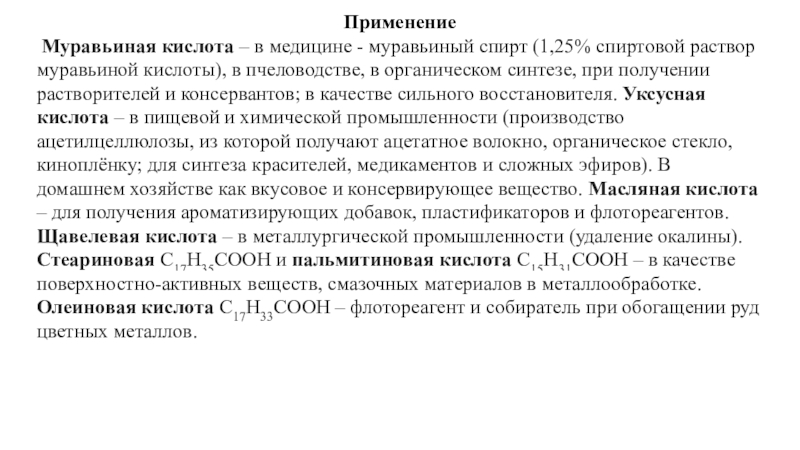муравьиной кислоты), в пчеловодстве, в органическом синтезе, при получении растворителей и консервантов; в качестве сильного восстановителя. Уксусная кислота – в пищевой и химической промышленности (производство ацетилцеллюлозы, из которой получают ацетатное волокно, органическое стекло, киноплёнку; для синтеза красителей, медикаментов и сложных эфиров). В домашнем хозяйстве как вкусовое и консервирующее вещество. Масляная кислота – для получения ароматизирующих добавок, пластификаторов и флотореагентов. Щавелевая кислота – в металлургической промышленности (удаление окалины). Стеариновая C17H35COOH и пальмитиновая кислота C15H31COOH – в качестве поверхностно-активных веществ, смазочных материалов в металлообработке. Олеиновая кислота C17H33COOH – флотореагент и собиратель при обогащении руд цветных металлов.