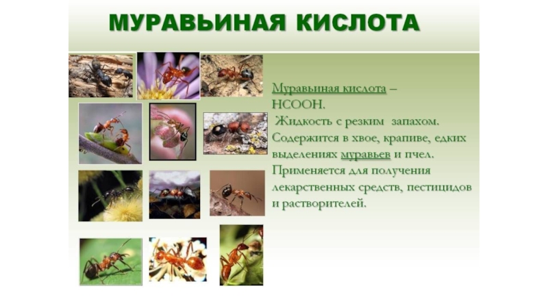 Муравьиная кислота – в медицине - муравьиный спирт (1,25% спиртовой раствор муравьиной кислоты), в пчеловодстве, в органическом