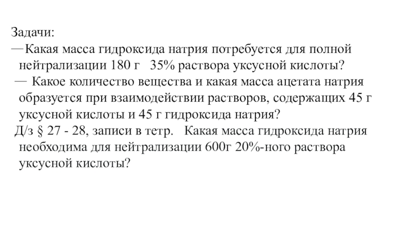 Д/з § 27 - 28, записи в тетр. Какая масса гидроксида натрия необходима для нейтрализации 600г 20%-ного раствора уксусной кислоты?