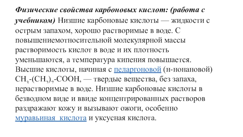 с острым запахом, хорошо растворимые в воде. С повышениемотносительной молекулярной массы растворимость кислот в воде и их плотность уменьшаются, а температура кипения повышается. Высшие кислоты, начиная с пеларгоновой (н-нонановой) СН3-(СН2)7-СООН, — твердые вещества, без запаха, нерастворимые в воде. Низшие карбоновые кислоты в безводном виде и ввиде концентрированных растворов раздражают кожу и вызывают ожоги, особенно муравьиная кислота и уксусная кислота.