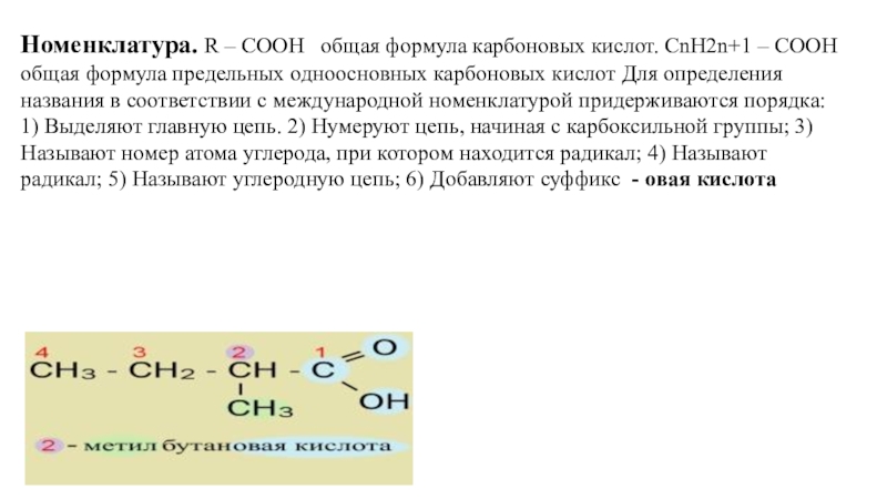 формула предельных одноосновных карбоновых кислот Для определения названия в соответствии с международной номенклатурой придерживаются порядка: 1) Выделяют главную цепь. 2) Нумеруют цепь, начиная с карбоксильной группы; 3) Называют номер атома углерода, при котором находится радикал; 4) Называют радикал; 5) Называют углеродную цепь; 6) Добавляют суффикс - овая кислота