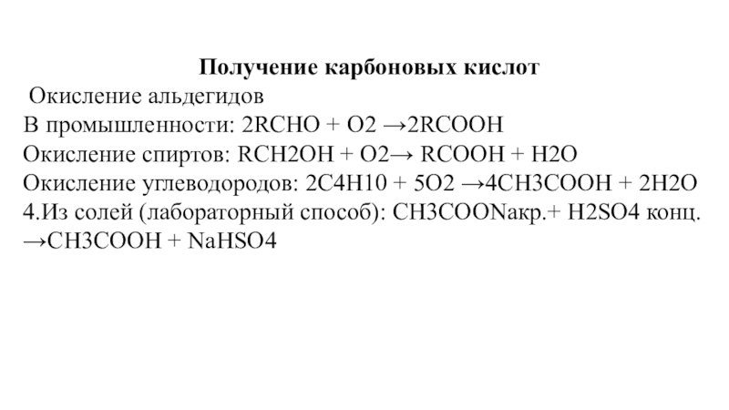 Окисление альдегидовВ промышленности: 2RCHO + O2 →2RCOOHОкисление спиртов: RCH2OH + O2→ RCOOH + H2OОкисление