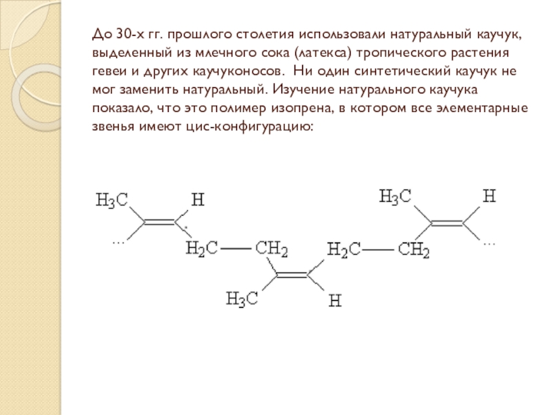 сока (латекса) тропического растения гевеи и других каучуконосов. Ни один синтетический каучук не мог заменить натуральный. Изучение натурального каучука показало, что это полимер изопрена, в котором все элементарные звенья имеют цис-конфигурацию: