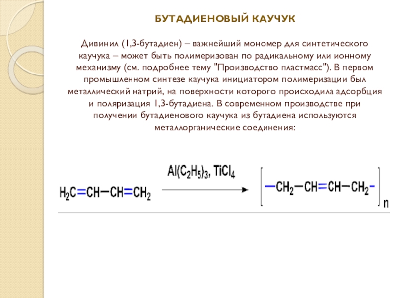 быть полимеризован по радикальному или ионному механизму (см. подробнее тему "Производство пластмасс"). В первом промышленном синтезе каучука инициатором полимеризации был металлический натрий, на поверхности которого происходила адсорбция и поляризация 1,3-бутадиена. В современном производстве при получении бутадиенового каучука из бутадиена используются металлорганические соединения: