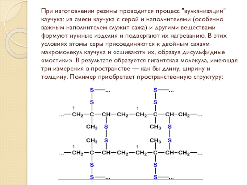 серой и наполнителями (особенно важным наполнителем служит сажа) и другими веществами формуют нужные изделия и подвергают их нагреванию. В этих условиях атомы серы присоединяются к двойным связям макромолекул каучука и «сшивают» их, образуя дисульфидные «мостики». В результате образуется гигантская молекула, имеющая три измерения в пространстве — как бы длину, ширину и толщину. Полимер приобретает пространственную структуру: