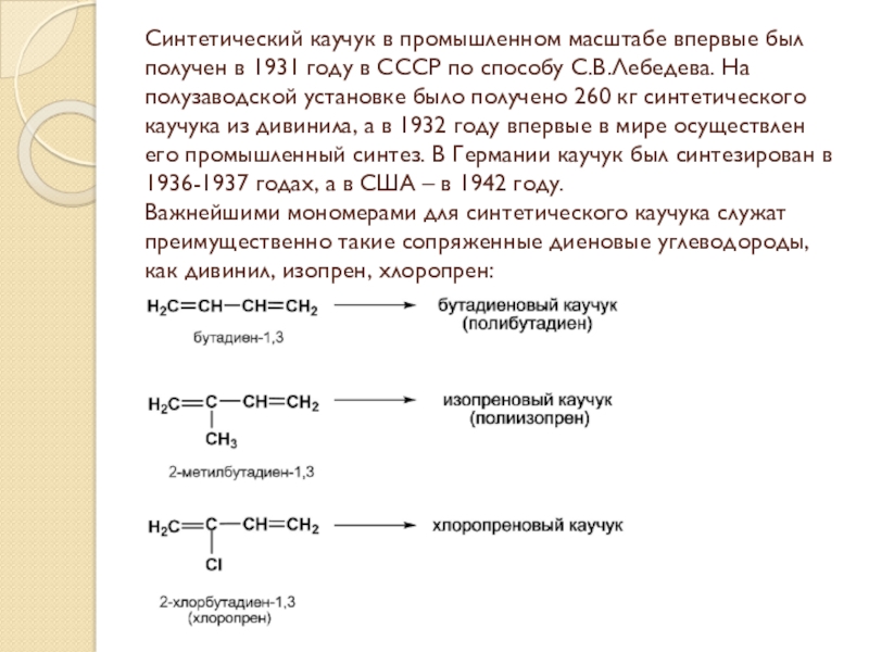 в СССР по способу С.В.Лебедева. На полузаводской установке было получено 260 кг синтетического каучука из дивинила, а в 1932 году впервые в мире осуществлен его промышленный синтез. В Германии каучук был синтезирован в 1936-1937 годах, а в США – в 1942 году.