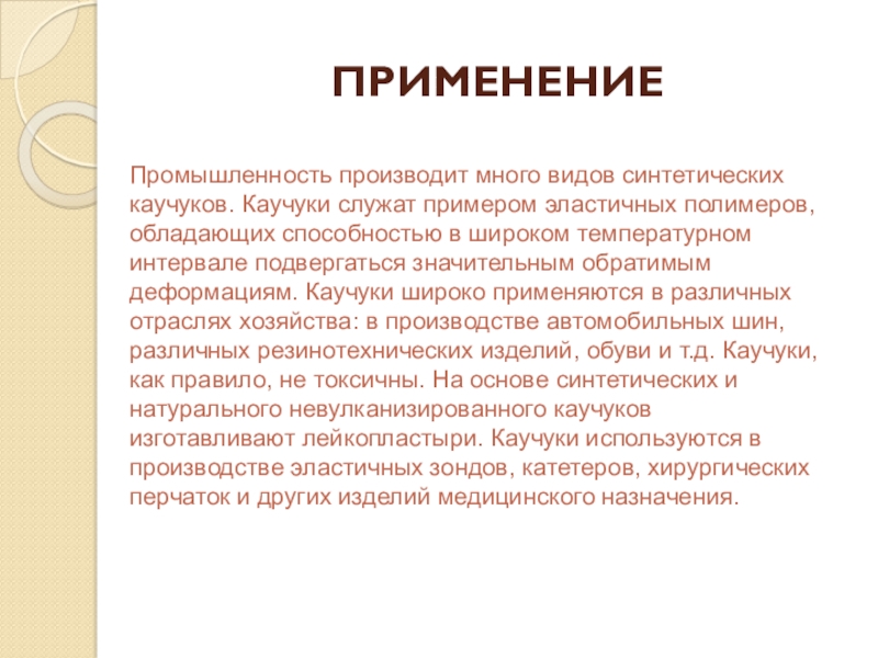 обладающих способностью в широком температурном интервале подвергаться значительным обратимым деформациям. Каучуки широко применяются в различных отраслях хозяйства: в производстве автомобильных шин, различных резинотехнических изделий, обуви и т.д. Каучуки, как правило, не токсичны. На основе синтетических и натурального невулканизированного каучуков изготавливают лейкопластыри. Каучуки используются в производстве эластичных зондов, катетеров, хирургических перчаток и других изделий медицинского назначения.
