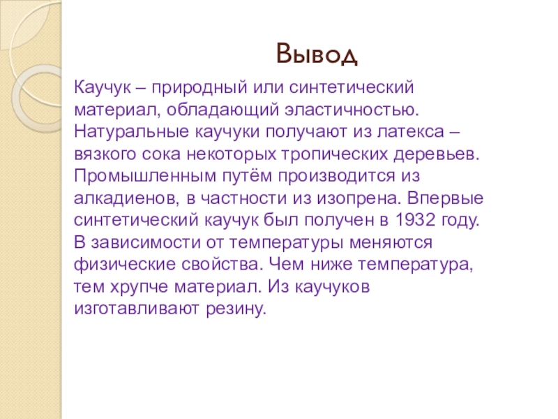 Каучук – природный или синтетический материал, обладающий эластичностью. Натуральные каучуки получают