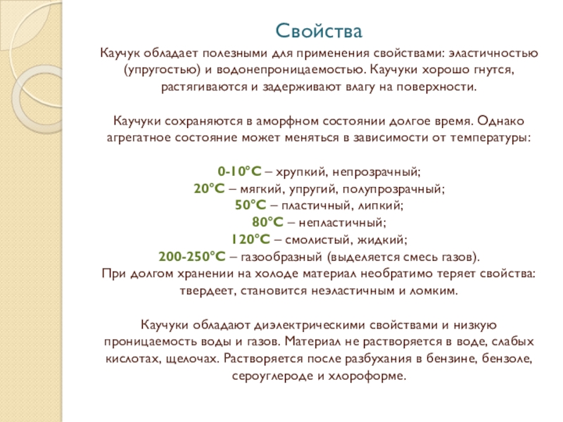 Каучук обладает полезными для применения свойствами: эластичностью (упругостью) и водонепроницаемостью. Каучуки