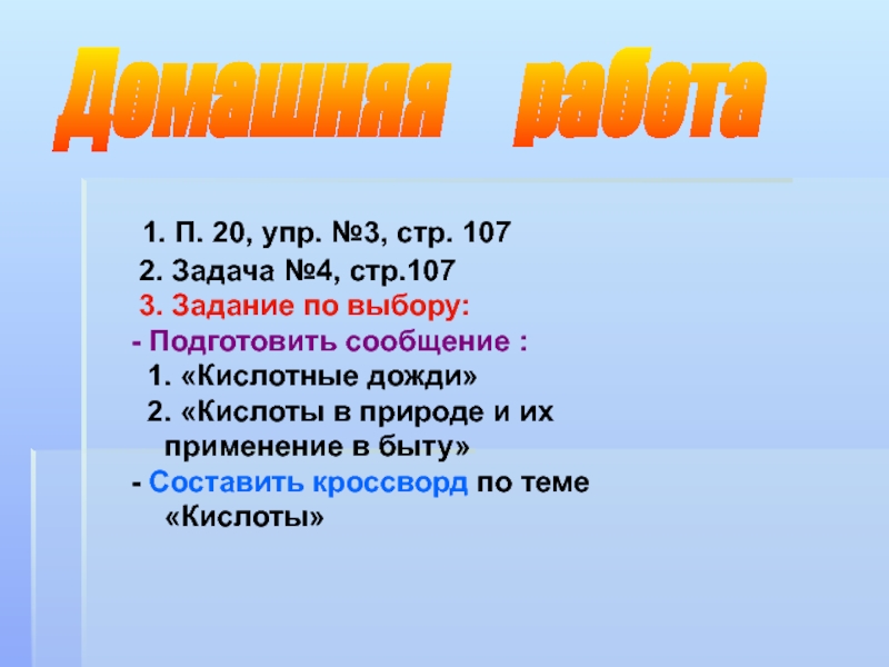 Домашняя   работа 1. П. 20, упр. №3, стр. 107 2. Задача №4, стр.107 3. Задание