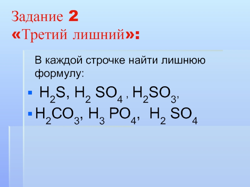 Задание 2  «Третий лишний»:  В каждой строчке найти лишнюю формулу: Н2S, Н2 SО4 , Н2SО3,
