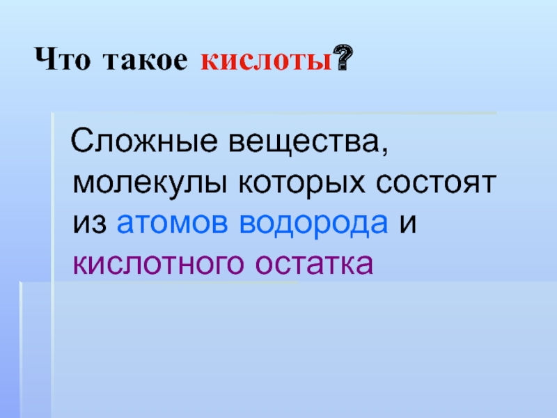 Что такое кислоты? Сложные вещества, молекулы которых состоят из атомов водорода и кислотного остатка