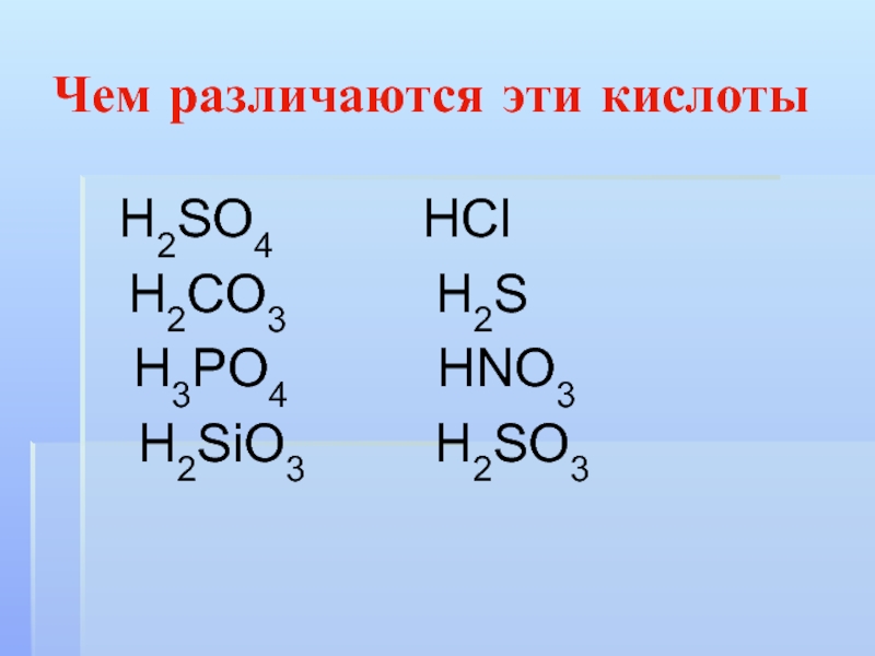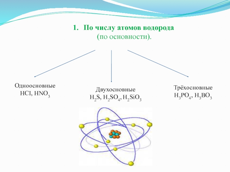 По числу атомов водорода(по основности).ОдноосновныеHCI, HNO3ТрёхосновныеH3PO4, H3BO3ДвухосновныеH2S, H2SO4, H2SiO3