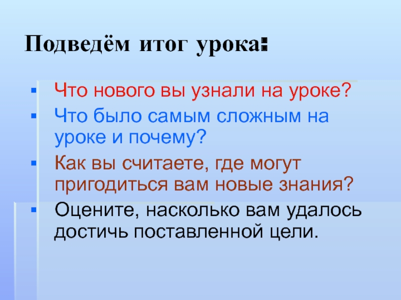 Подведём итог урока:Что нового вы узнали на уроке? Что было самым сложным на уроке и почему?Как вы