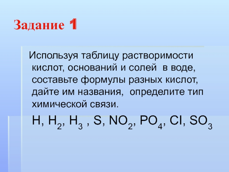 Задание 1 Используя таблицу растворимости кислот, оснований и солей в воде, составьте формулы разных кислот, дайте им