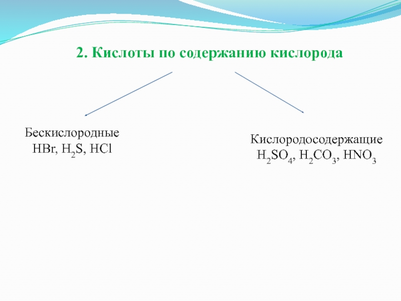 2. Кислоты по содержанию кислородаБескислородныеHBr, H2S, HClКислородосодержащиеH2SO4, H2CO3, HNO3