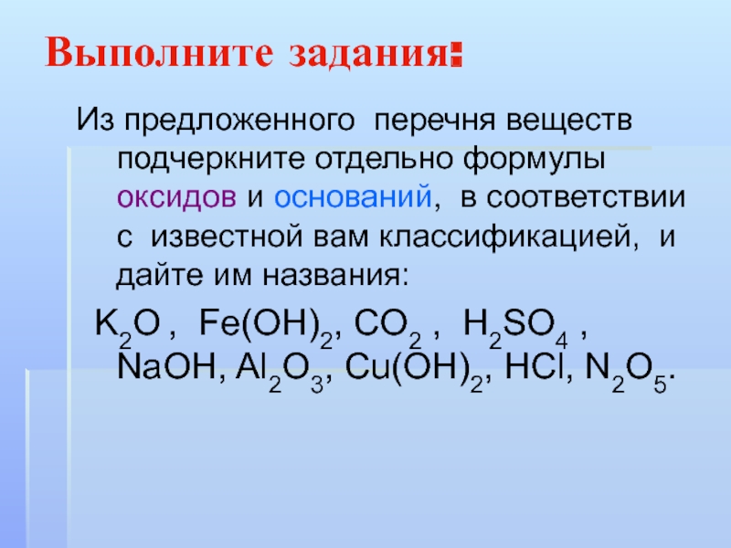 Выполните задания:  Из предложенного перечня веществ подчеркните отдельно формулы оксидов и оснований, в соответствии с известной