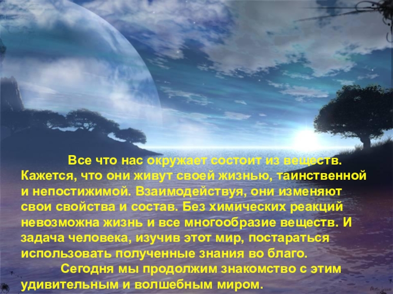 Все что нас окружает состоит из веществ. Кажется, что они живут своей жизнью, таинственной и непостижимой. Взаимодействуя, они изменяют свои свойства и состав. Без химических реакций невозможна жизнь и все многообразие веществ. И задача человека, изучив этот мир, постараться использовать полученные знания во благо.