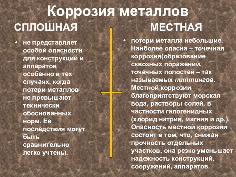 потери металла небольшие. Наиболее опасна – точечная коррозия(образование сквозных поражений, точечных полостей – так называемых питтингов. Местной коррозии благоприятствуют морская вода, растворы солей, в частности галогенидных (хлорид натрия, магния и др.). Опасность местной коррозии состоит в том, что, снижая прочность отдельных участков, она резко уменьшает надежность конструкций, сооружений, аппаратов.