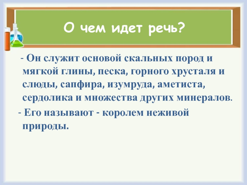 и мягкой глины, песка, горного хрусталя и слюды, сапфира, изумруда, аметиста, сердолика и множества других минералов.