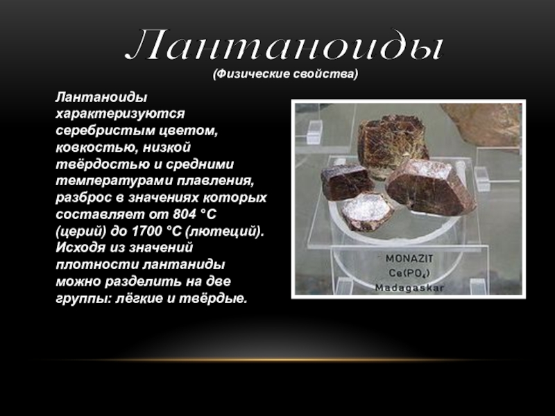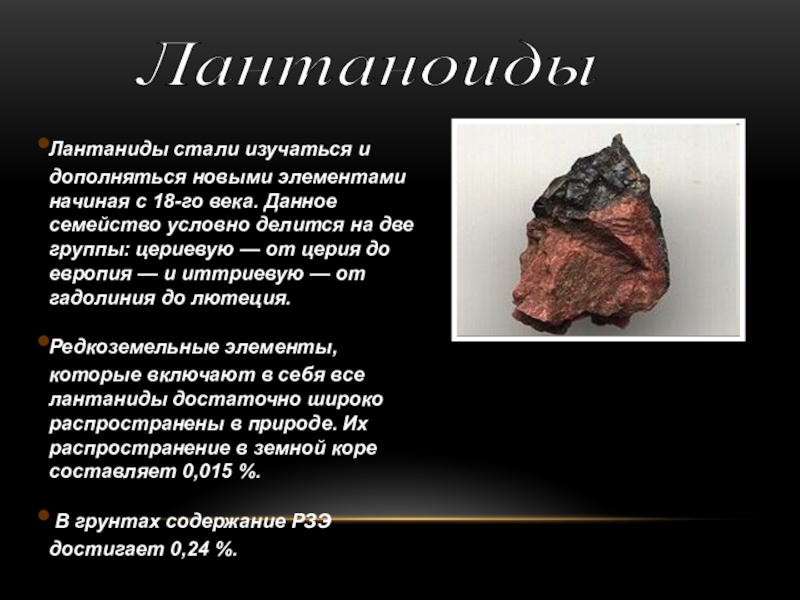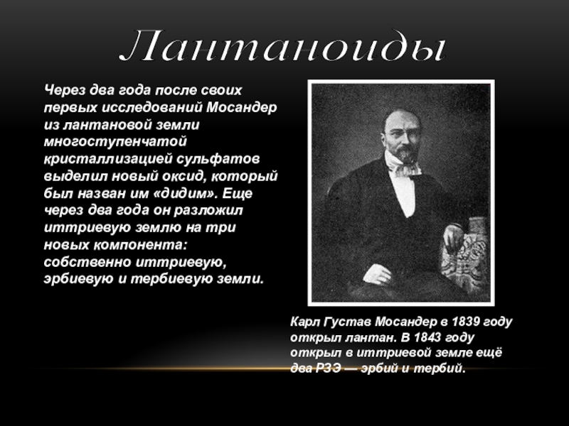 Карл Густав Моcандер в 1839 году открыл лантан. В 1843 году открыл в иттриевой земле ещё два РЗЭ — эрбий и тербий.