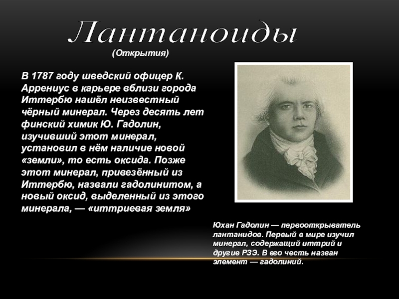 Юхан Гадолин — первооткрыватель лантанидов. Первый в мире изучил минерал, содержащий иттрий и другие РЗЭ. В его честь назван элемент — гадолиний.