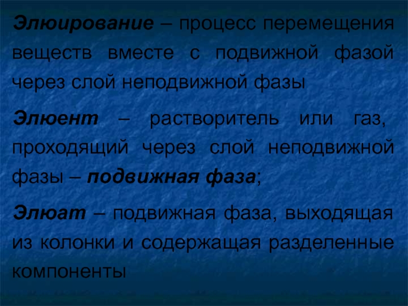 Слайд 5Элюирование – процесс перемещения веществ вместе с подвижной фазой через слой