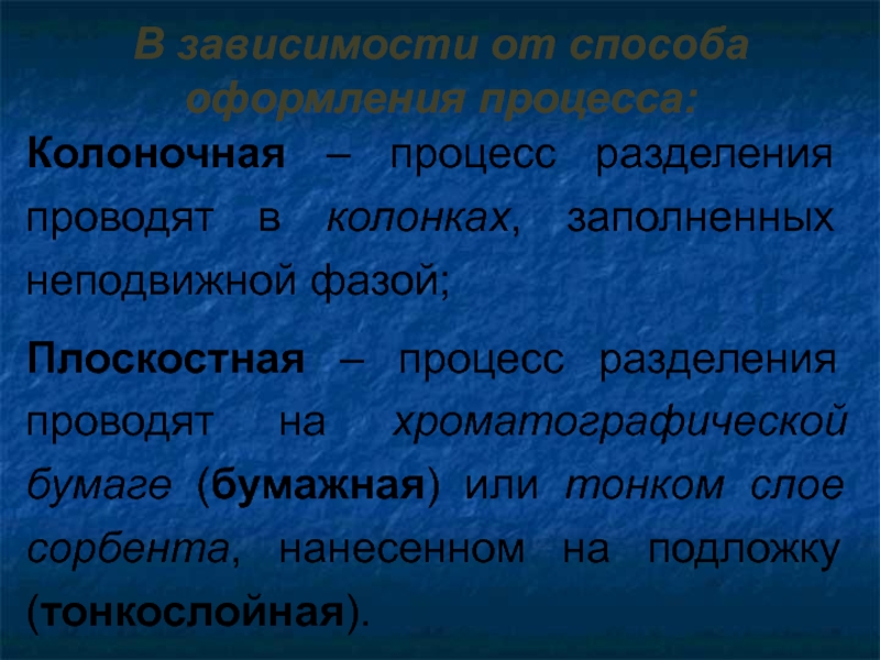 В зависимости от способа оформления процесса: Колоночная – процесс разделения проводят в колонках, заполненных неподвижной фазой;Плоскостная –