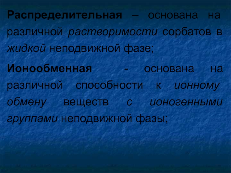 Распределительная – основана на различной растворимости сорбатов в жидкой неподвижной фазе;Ионообменная - основана на различной способности к
