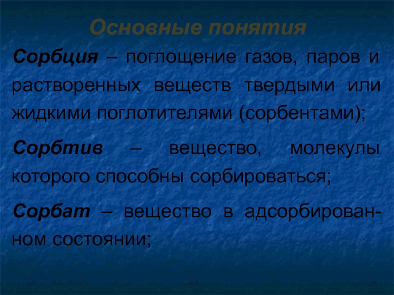 Основные понятия Сорбция – поглощение газов, паров и растворенных веществ твердыми или жидкими поглотителями (сорбентами);Сорбтив – вещество,