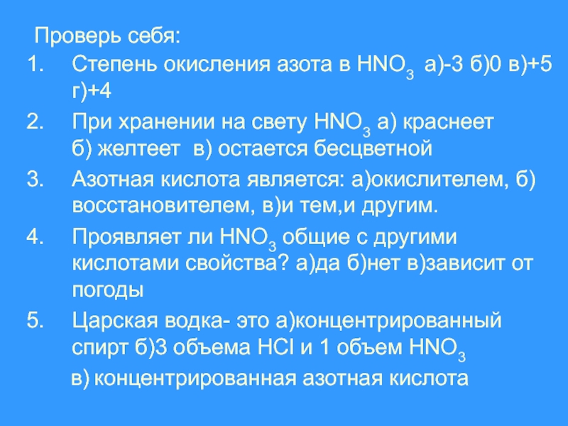 Проверь себя:Степень окисления азота в HNO3 а)-3 б)0 в)+5 г)+4При хранении на свету HNO3 а) краснеет