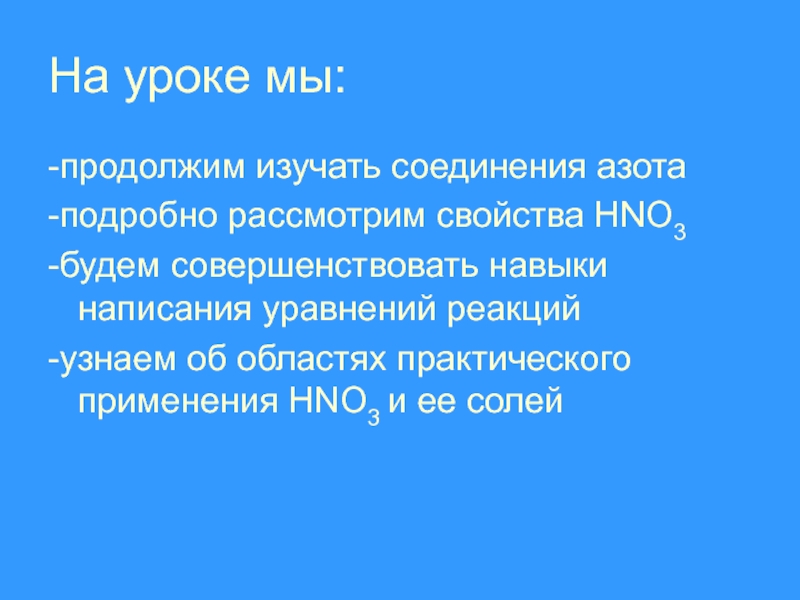 На уроке мы:-продолжим изучать соединения азота-подробно рассмотрим свойства HNO3 -будем совершенствовать навыки написания уравнений реакций-узнаем об областях