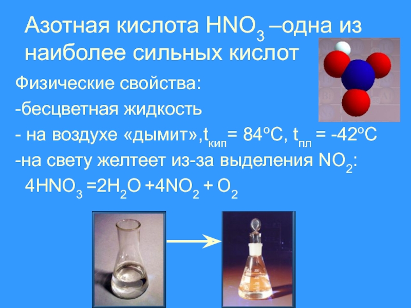 Азотная кислота HNO3 –одна из наиболее сильных кислотФизические свойства:-бесцветная жидкость- на воздухе «дымит»,tкип= 84оС, tпл = -42оС-на