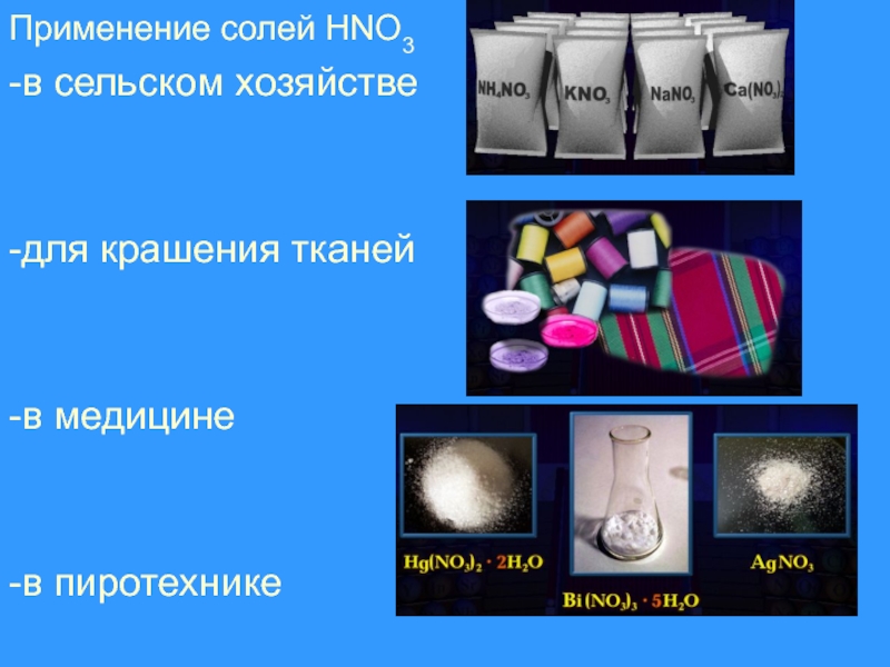 Применение солей HNO3-в сельском хозяйстве-для крашения тканей-в медицине-в пиротехнике