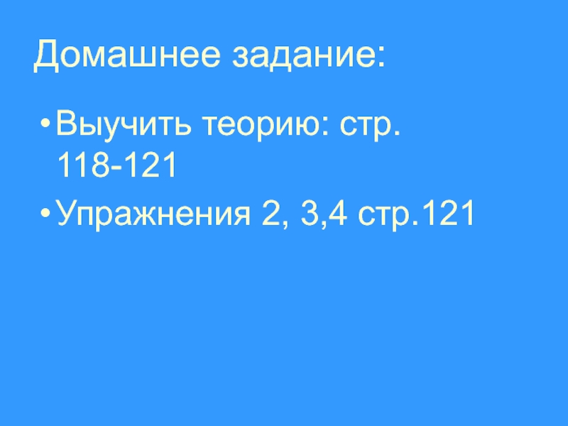 Домашнее задание:Выучить теорию: стр. 118-121Упражнения 2, 3,4 стр.121