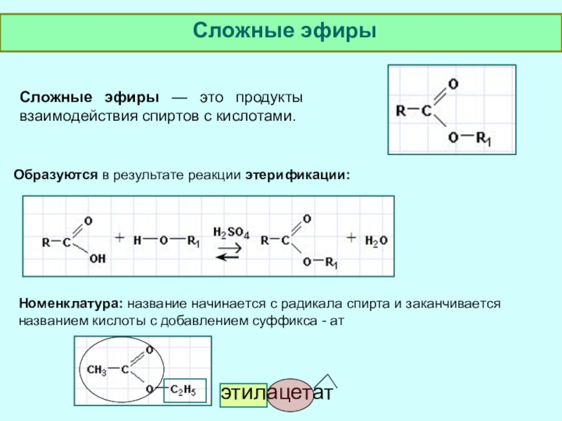Сложные эфиры — это продукты взаимодействия спиртов с кислотами.