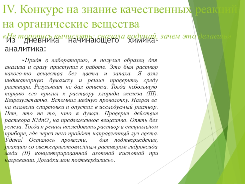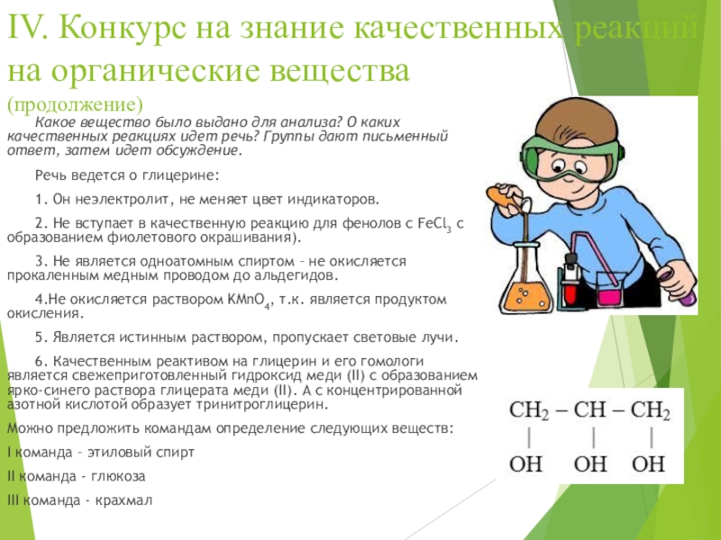 Слайд 9IV. Конкурс на знание качественных реакций на органические вещества