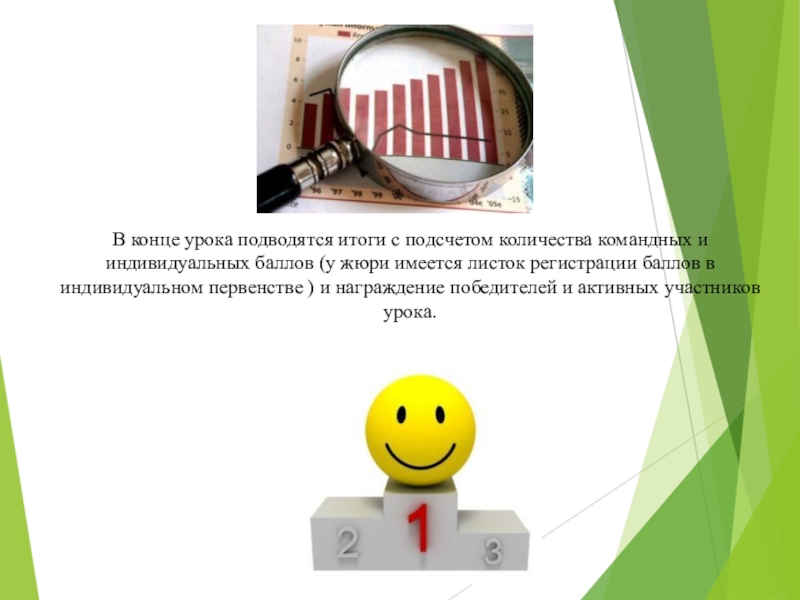 баллов (у жюри имеется листок регистрации баллов в индивидуальном первенстве ) и награждение победителей и активных участников урока.