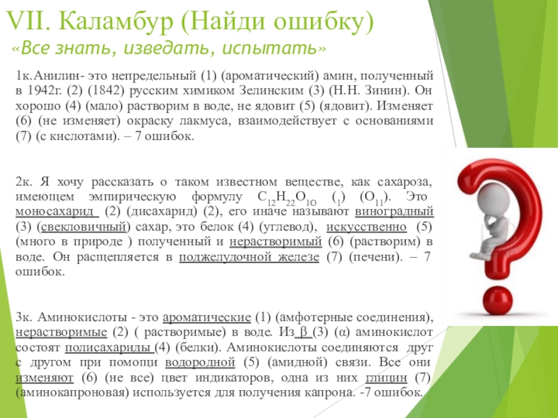 (ароматический) амин, полученный в 1942г. (2) (1842) русским химиком Зелинским (3) (Н.Н. Зинин). Он хорошо (4) (мало) растворим в воде, не ядовит (5) (ядовит). Изменяет (6) (не изменяет) окраску лакмуса, взаимодействует с основаниями (7) (с кислотами). – 7 ошибок.