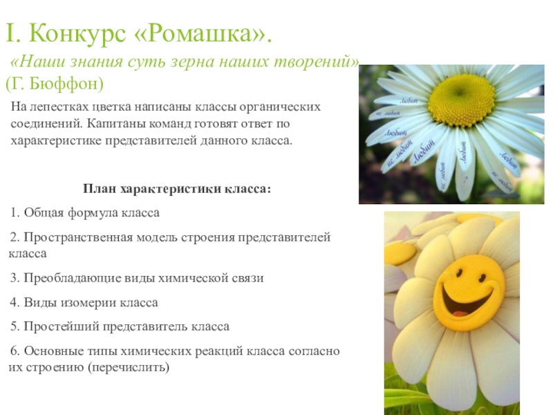 цветка написаны классы органических соединений. Капитаны команд готовят ответ по характеристике представителей данного класса.