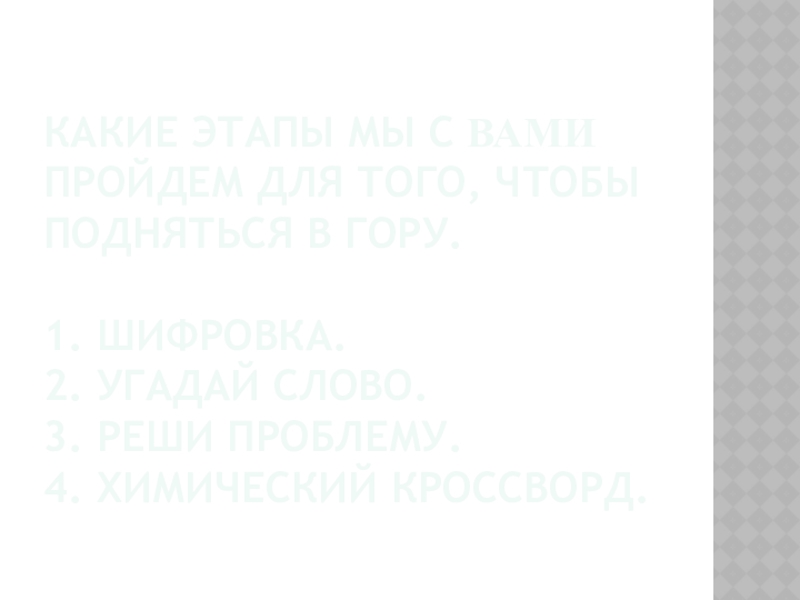 гору. 1. Шифровка. 2. Угадай слово. 3. Реши проблему. 4. Химический кроссворд.